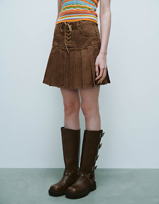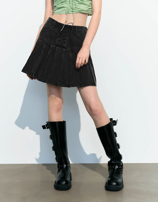 Lace Up Pleated Mini A-Line Denim Skirt