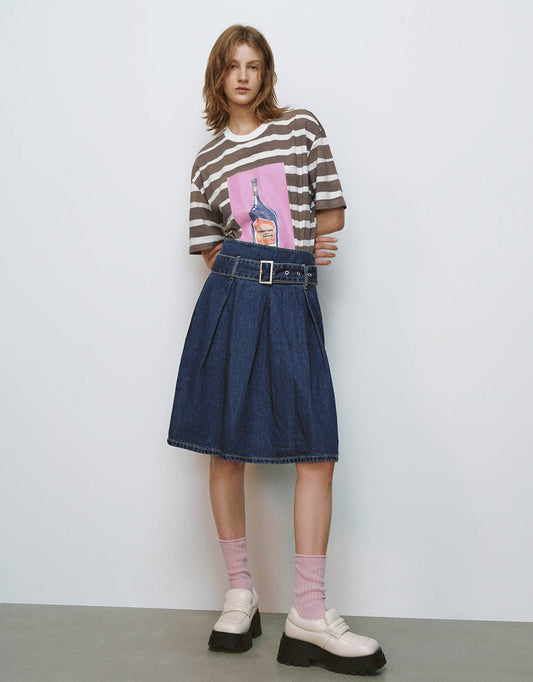 Pleated Mini A-Line Denim Skirt With Belt