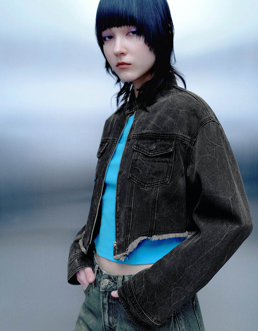 Raw Hem Zipper Front Denim Jacket