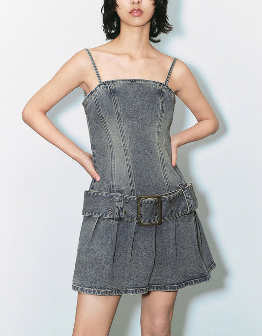 Sleeveless Skinny Denim Dress With Belt