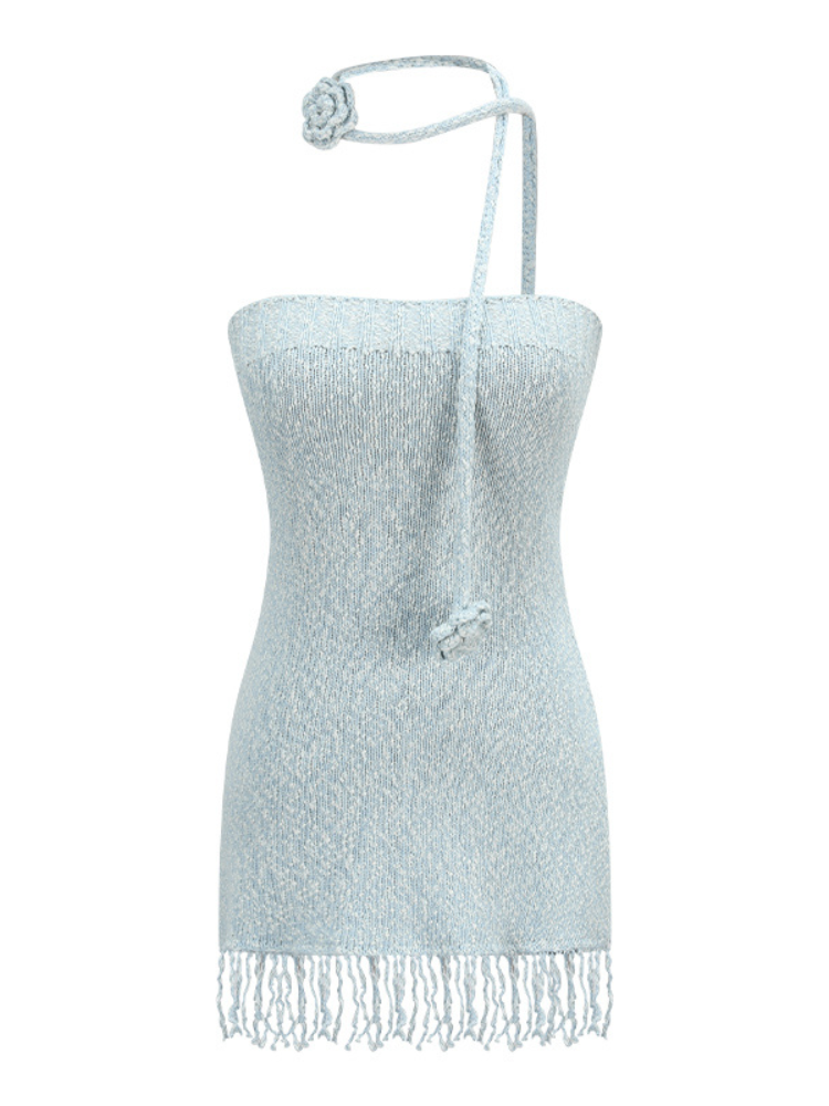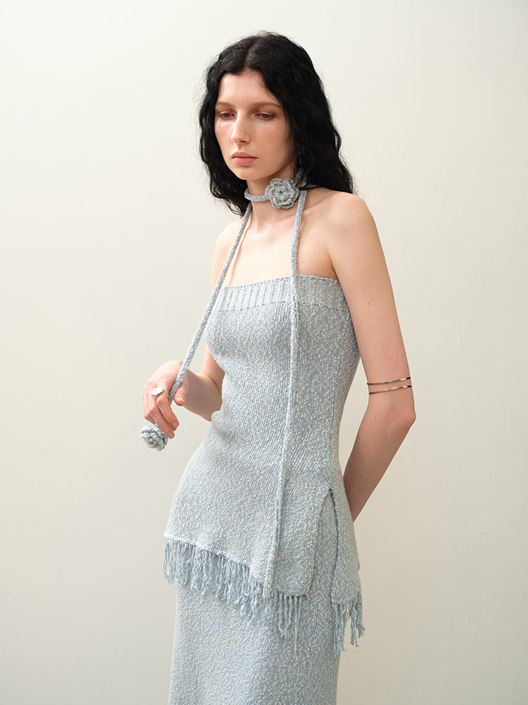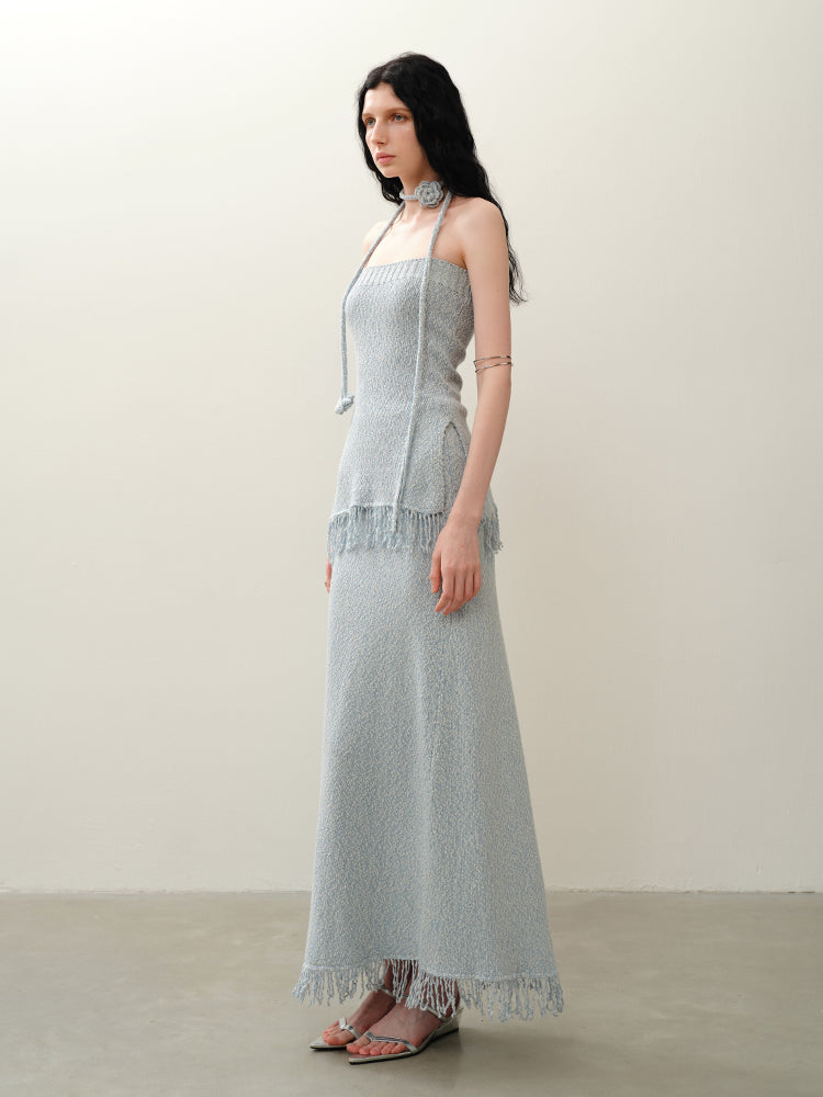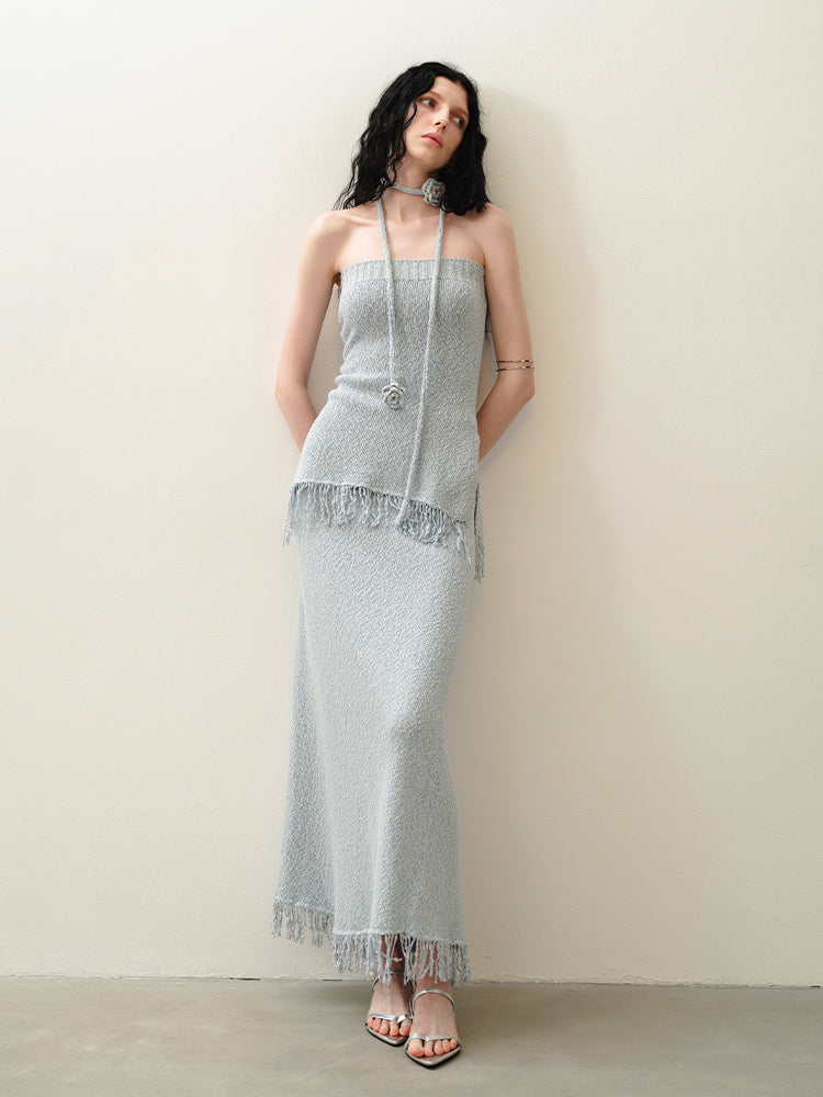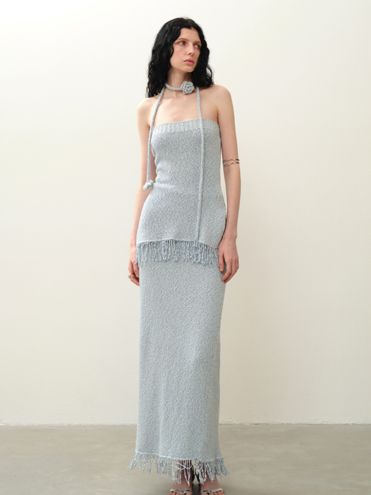 ブルークロシェタッセルストラップレススカートセット