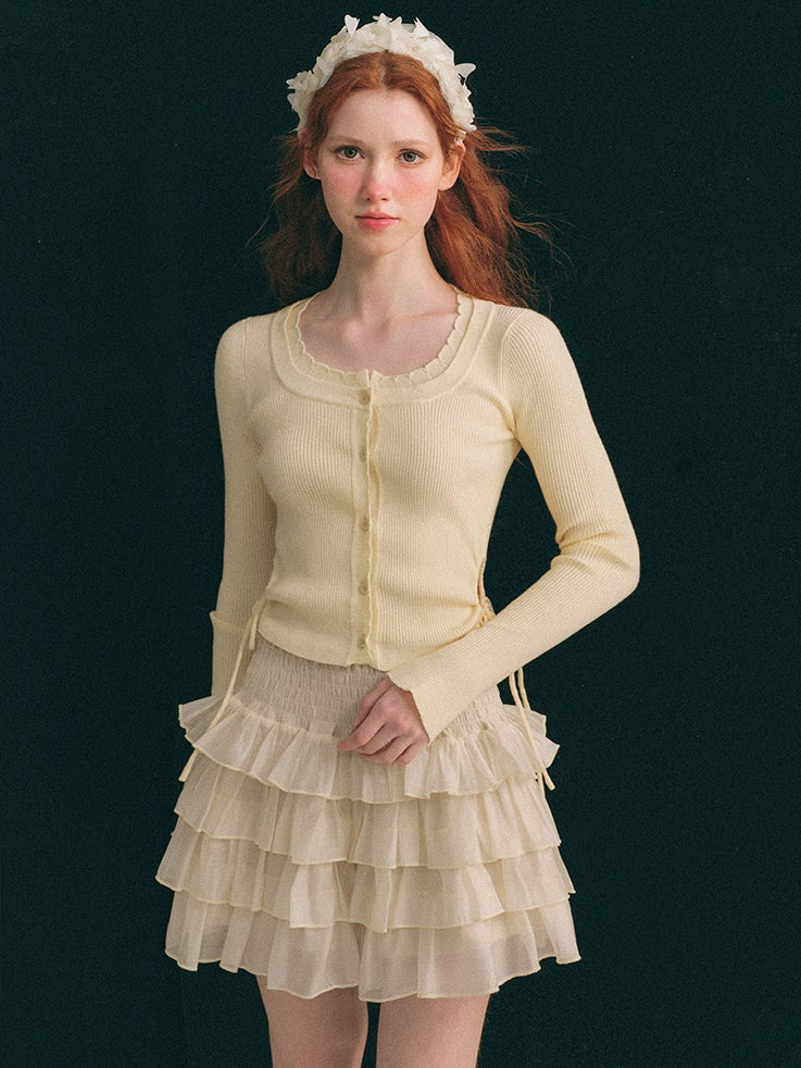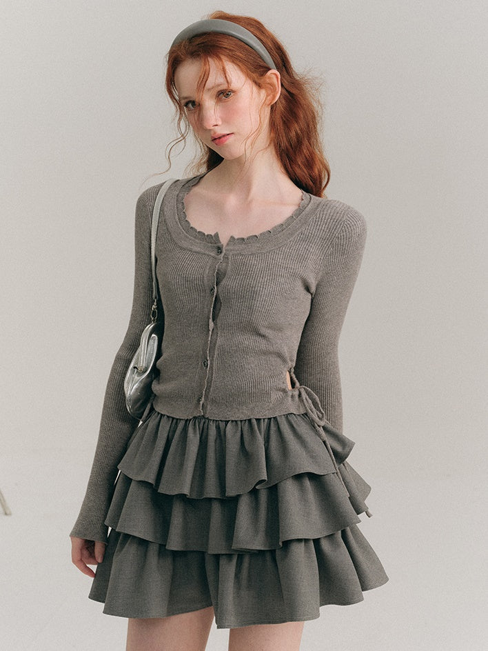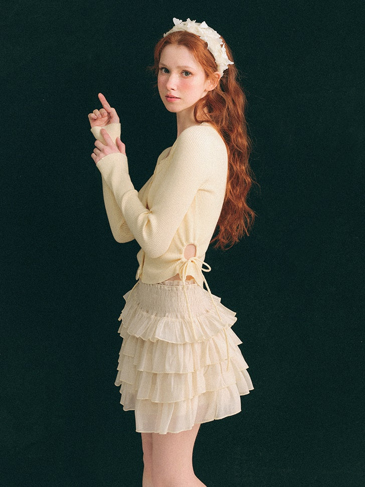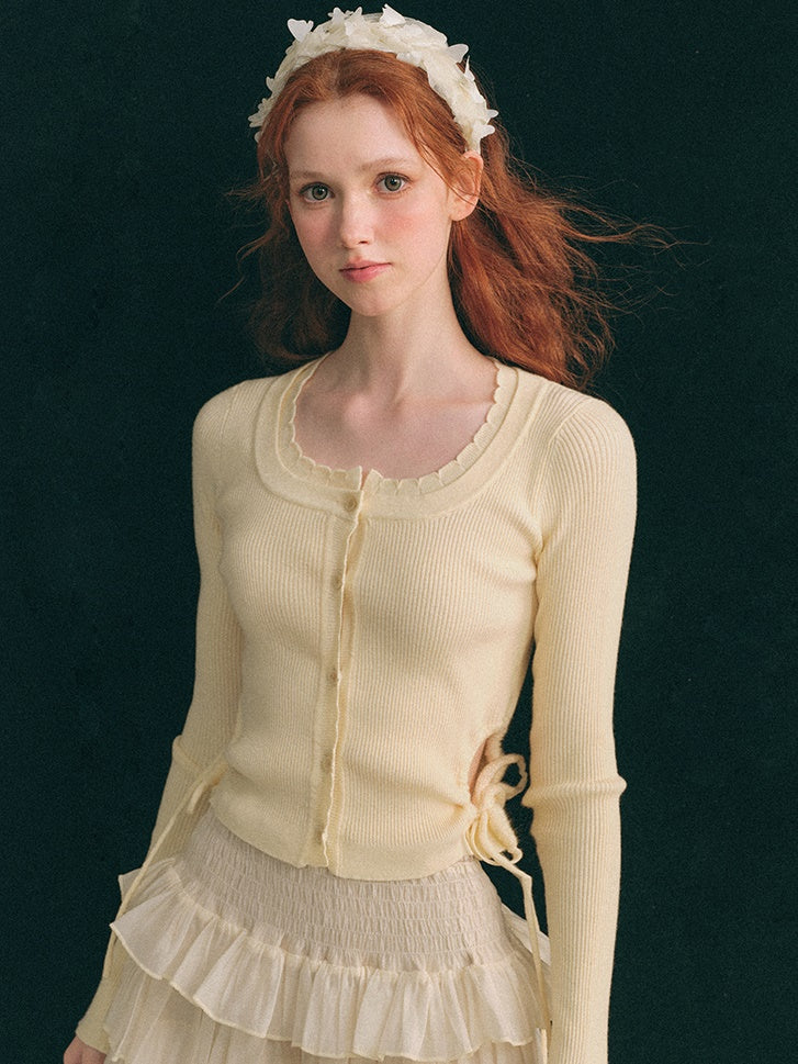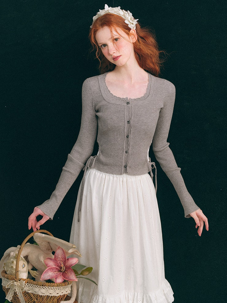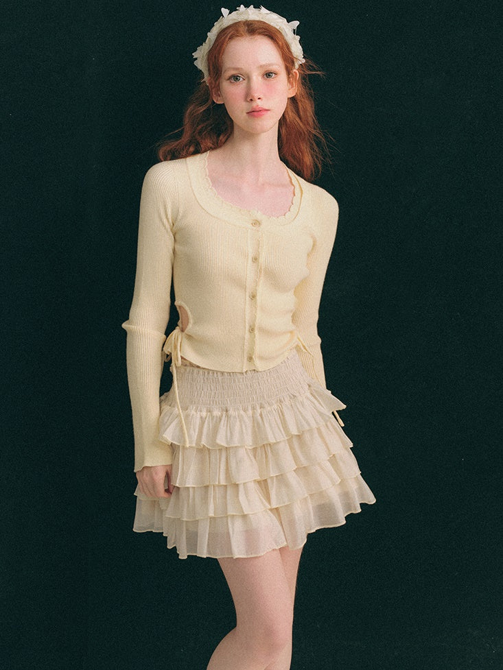 中空ウエスト Uネック クロップド丈 ニットカーディガン