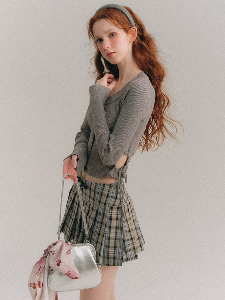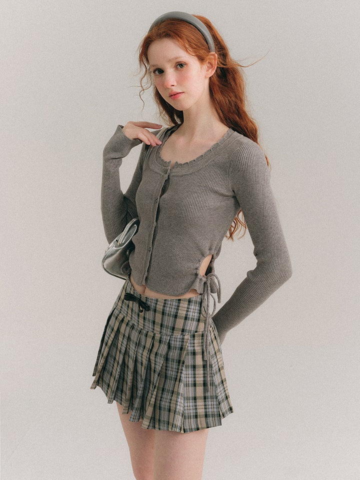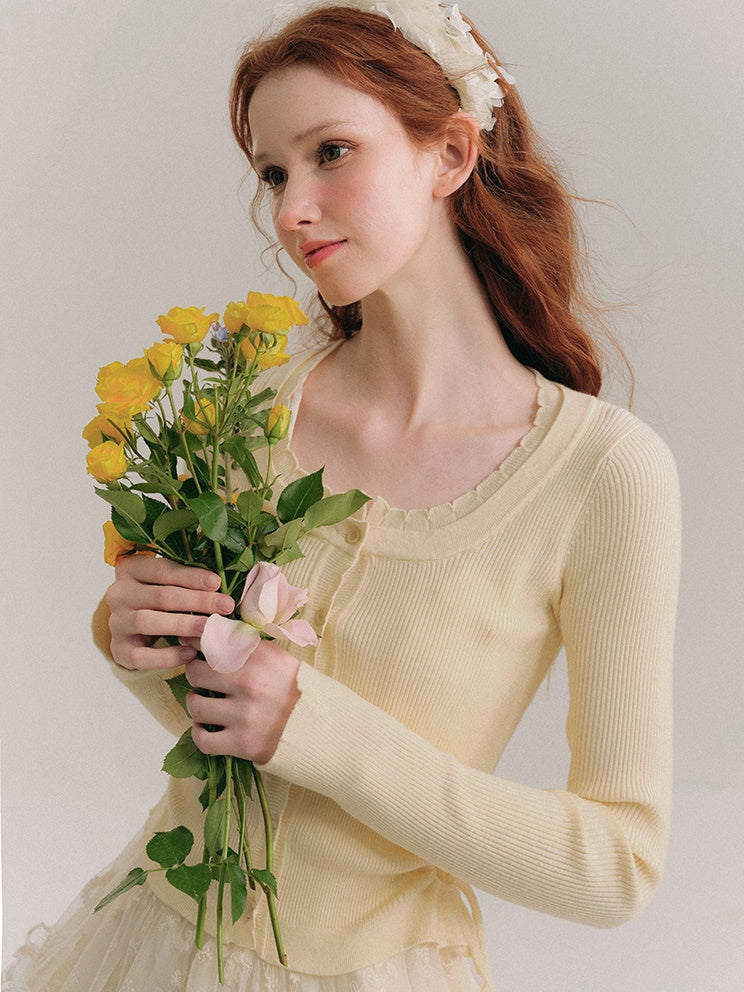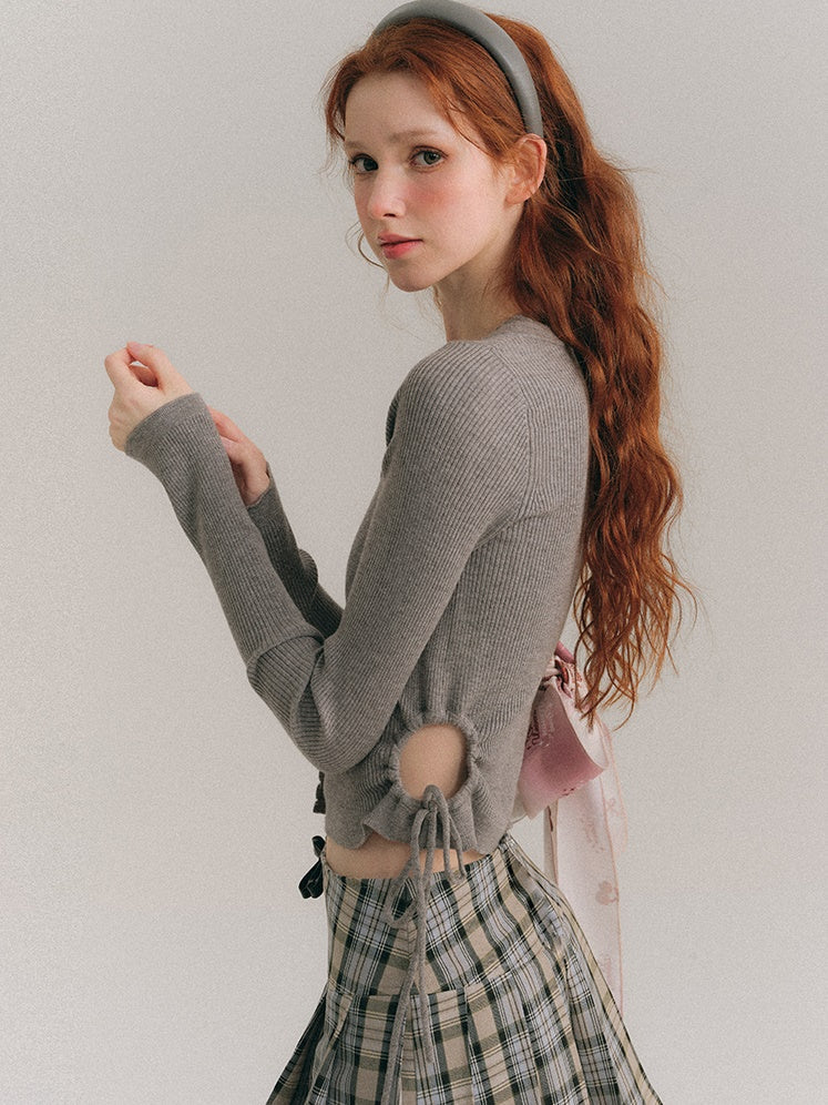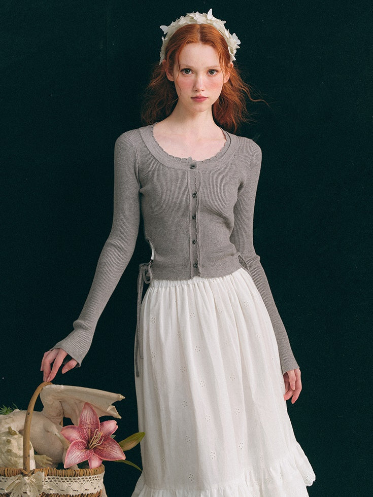 中空ウエスト Uネック クロップド丈 ニットカーディガン