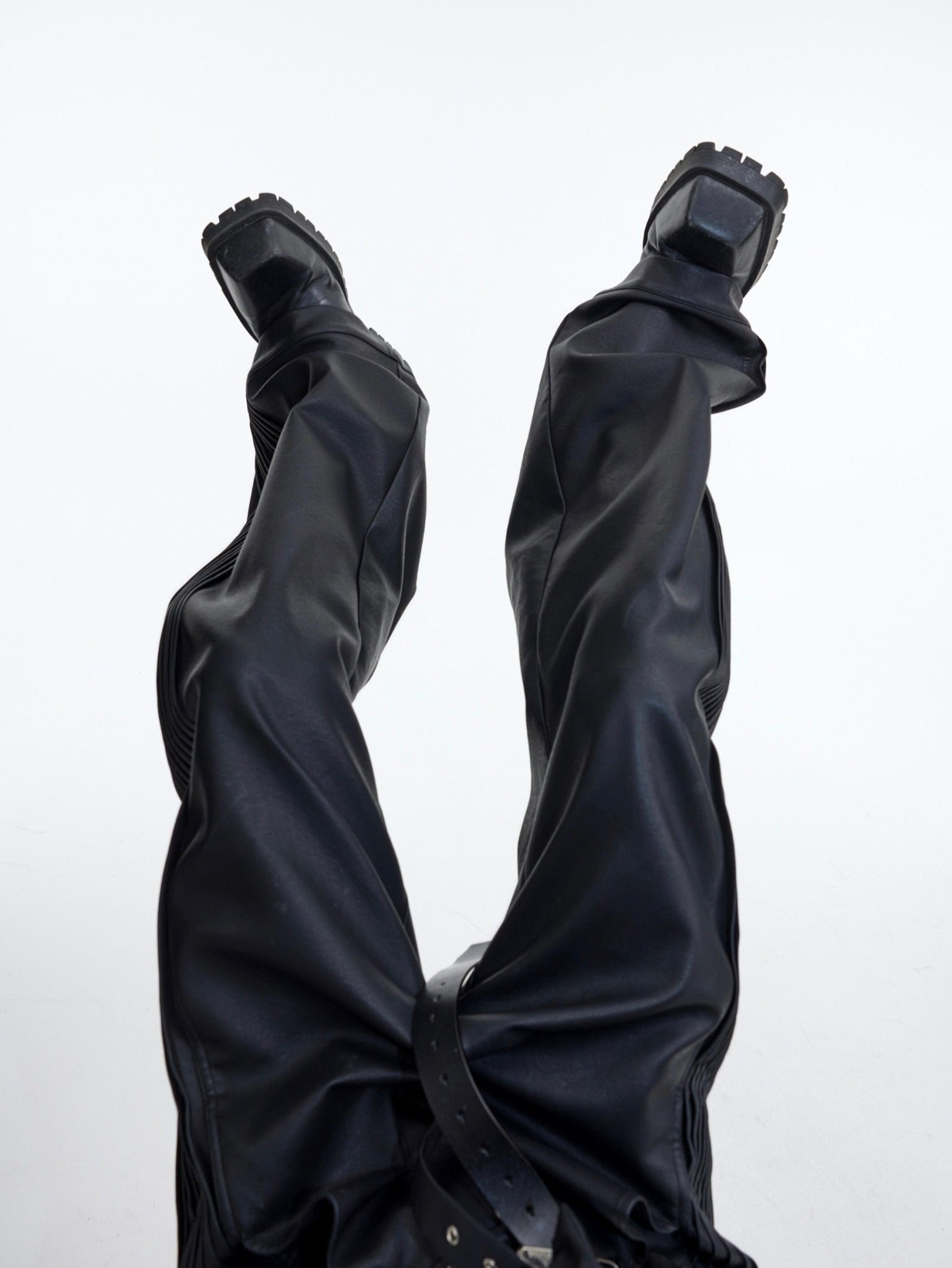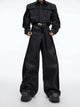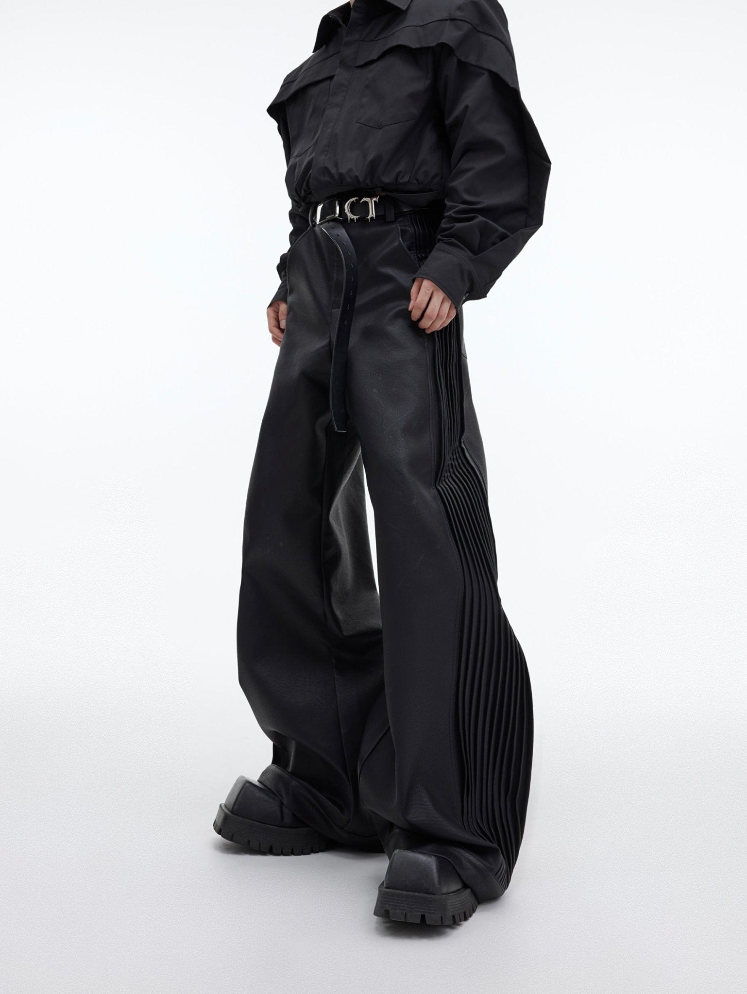- Embrace the unconventional with our Matte PU Leather Pleated Wide-Leg Trousers. The unique matte finish on the PU leather offers a soft yet structured drape, ensuring a flattering fit that's both comfortable and resistant to deformation. The side pleat detailing adds a touch of elegance, enhancing the leg line for a sleek silhouette.