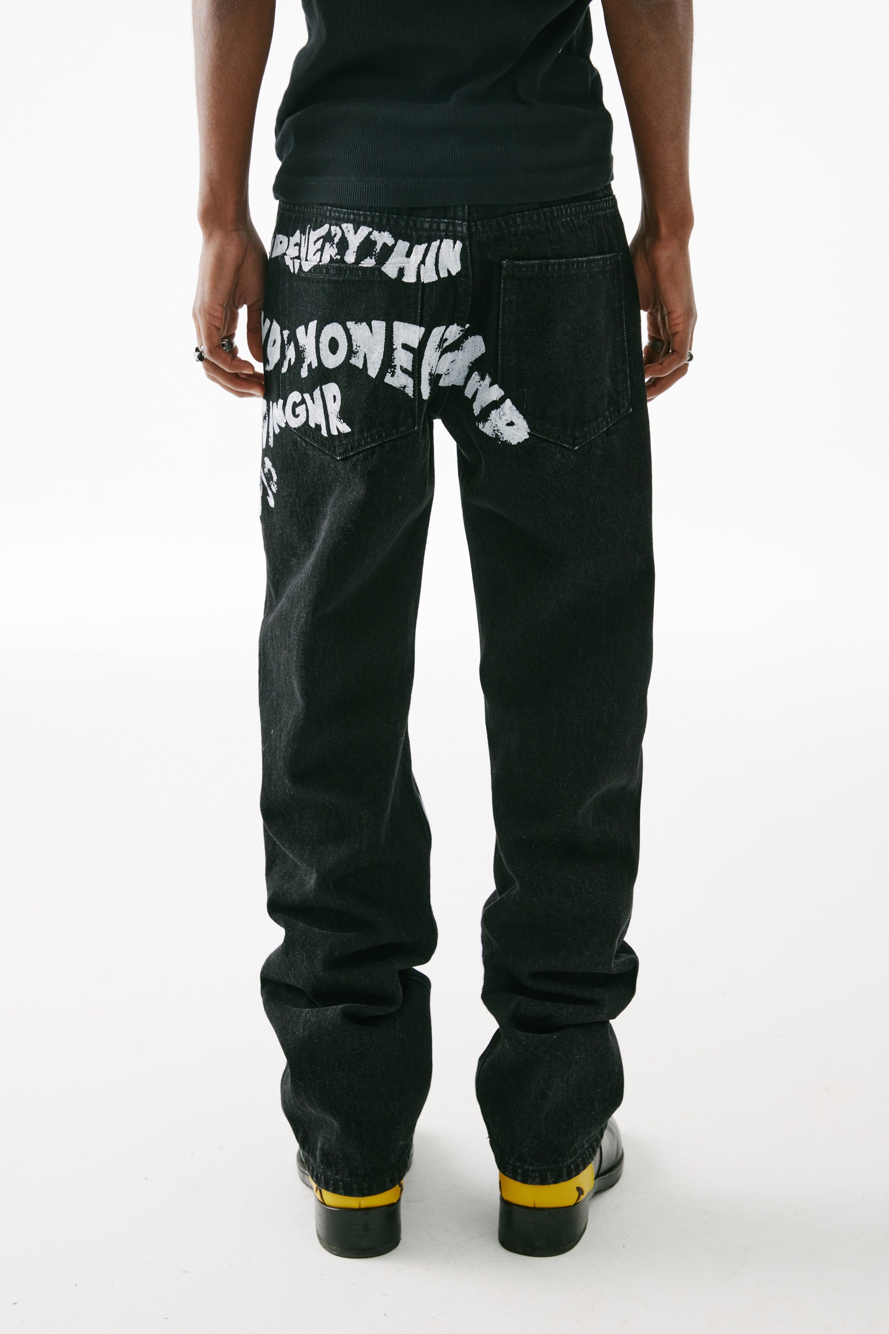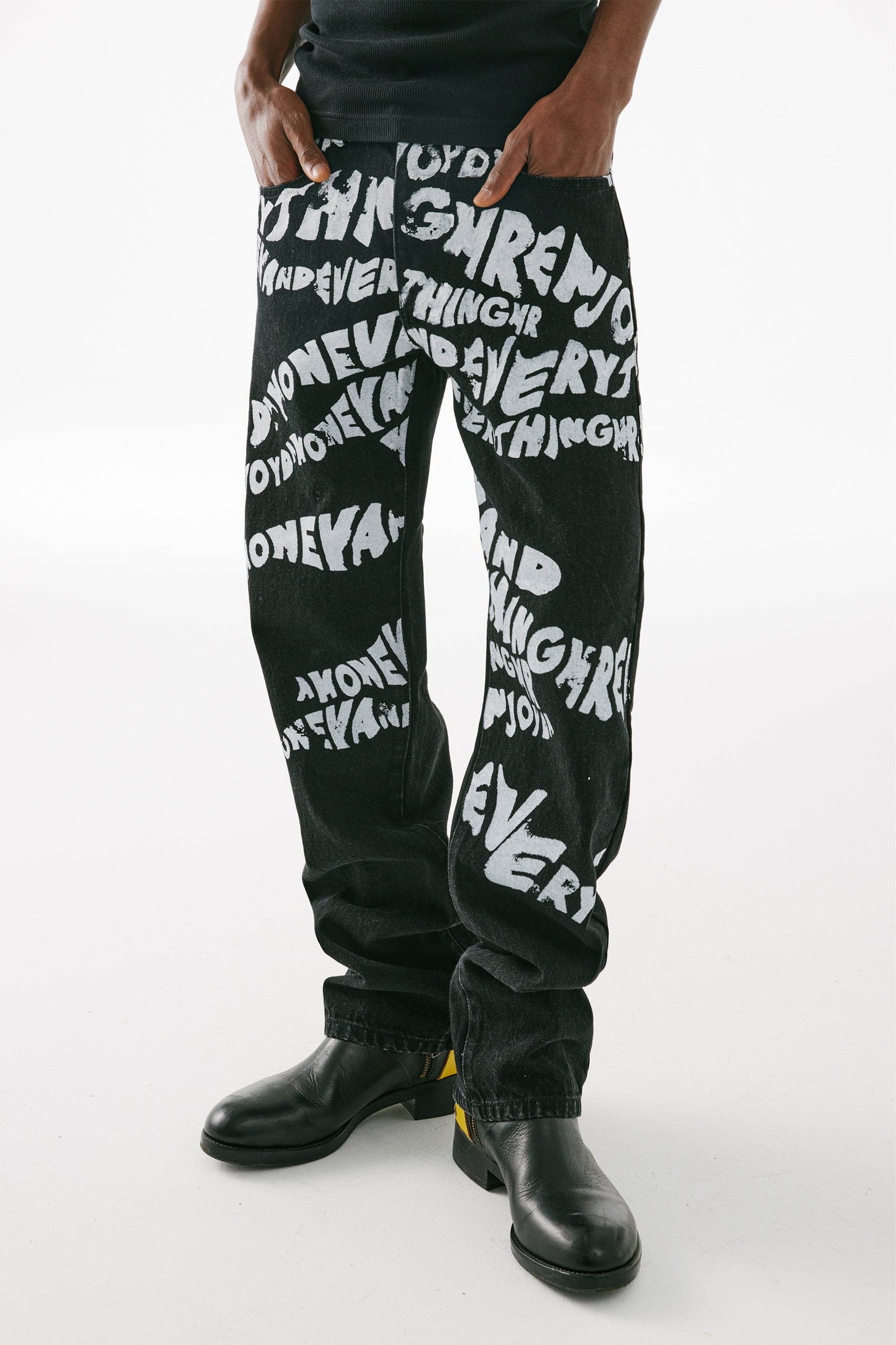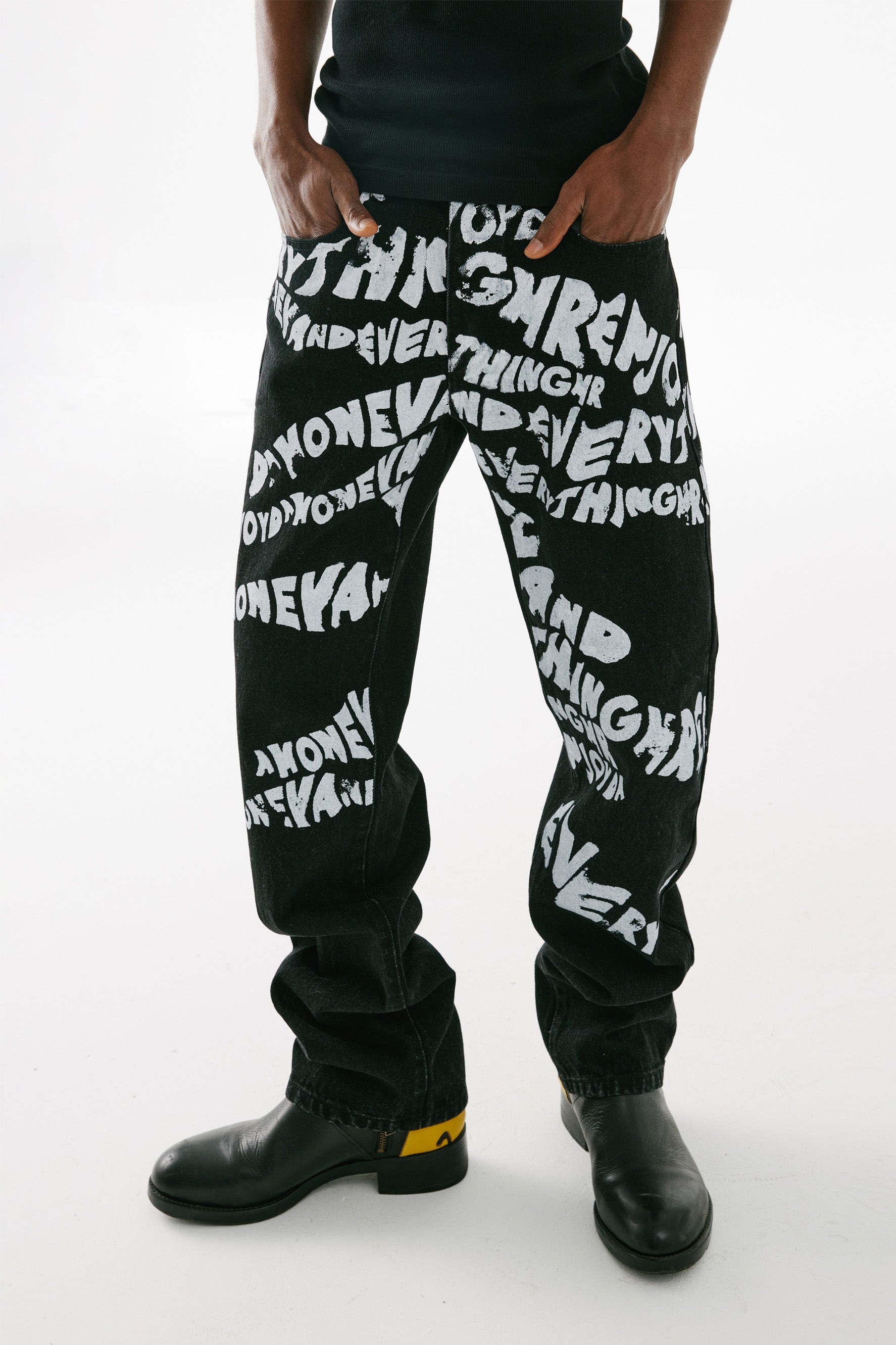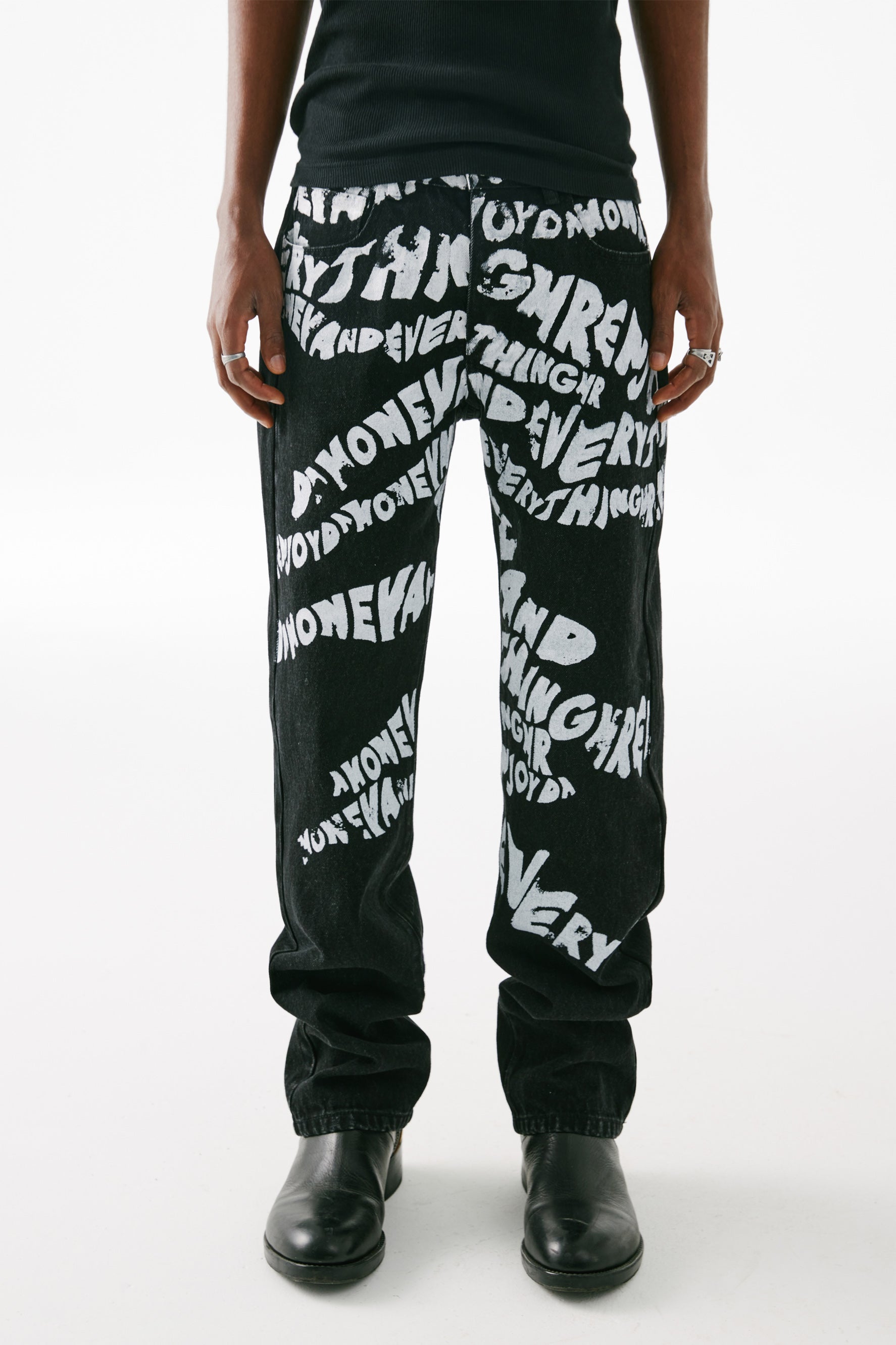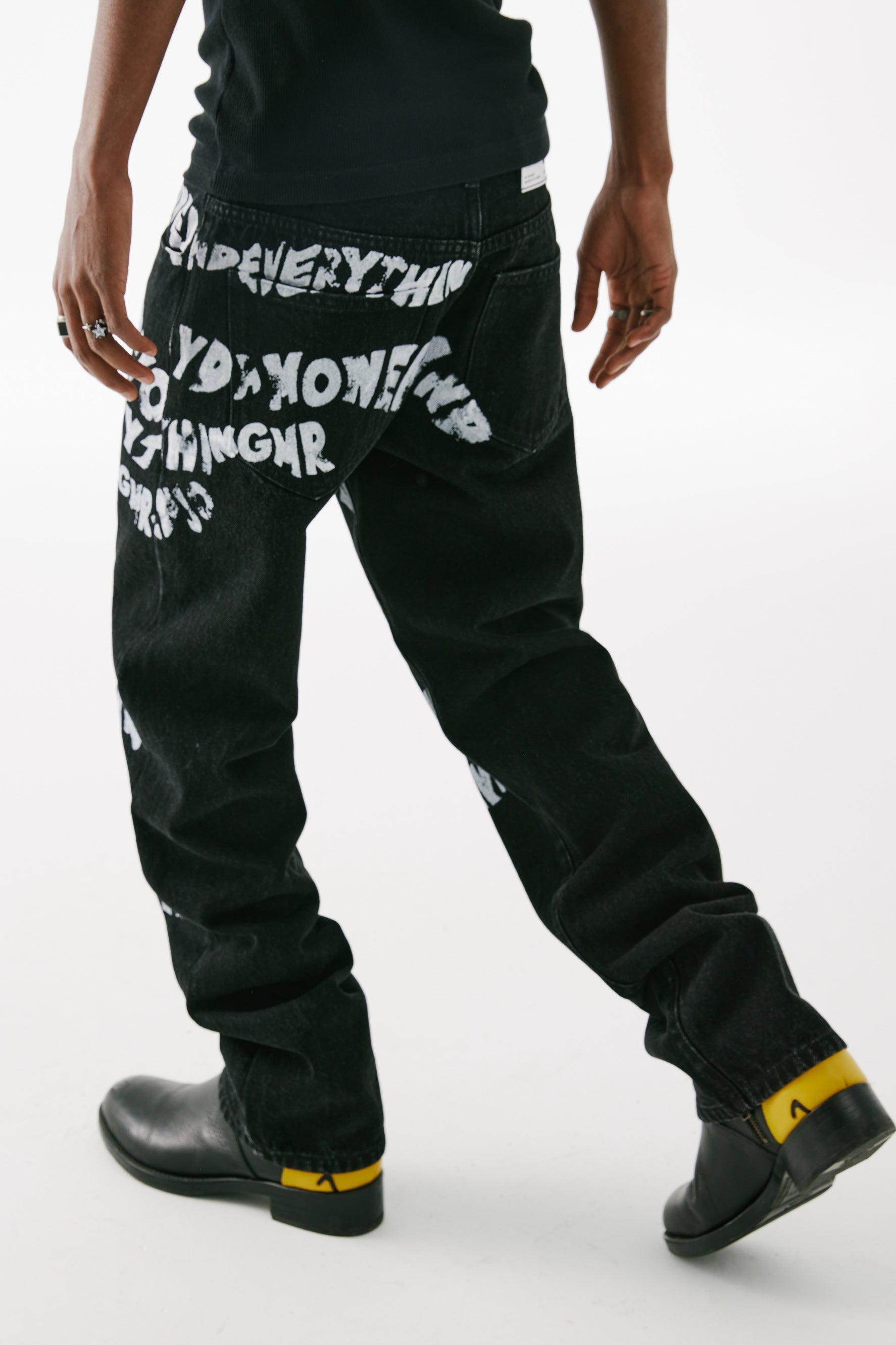 このジーンズは、レギュラーフィットで、少し伸縮性のあるコットンデニムで作られています。後ろのウエストバンドのレザージャケロンには、medm のロゴが入っています。詳細には全体にMedmロゴパターンプリントが含まれています