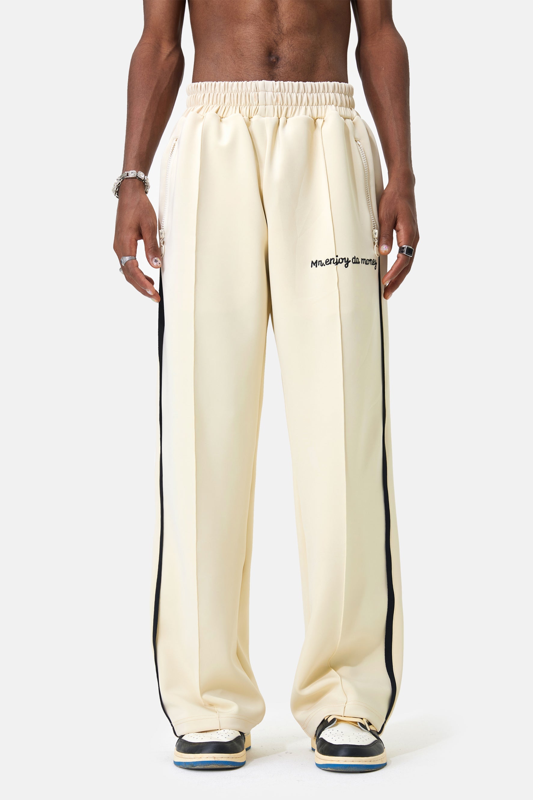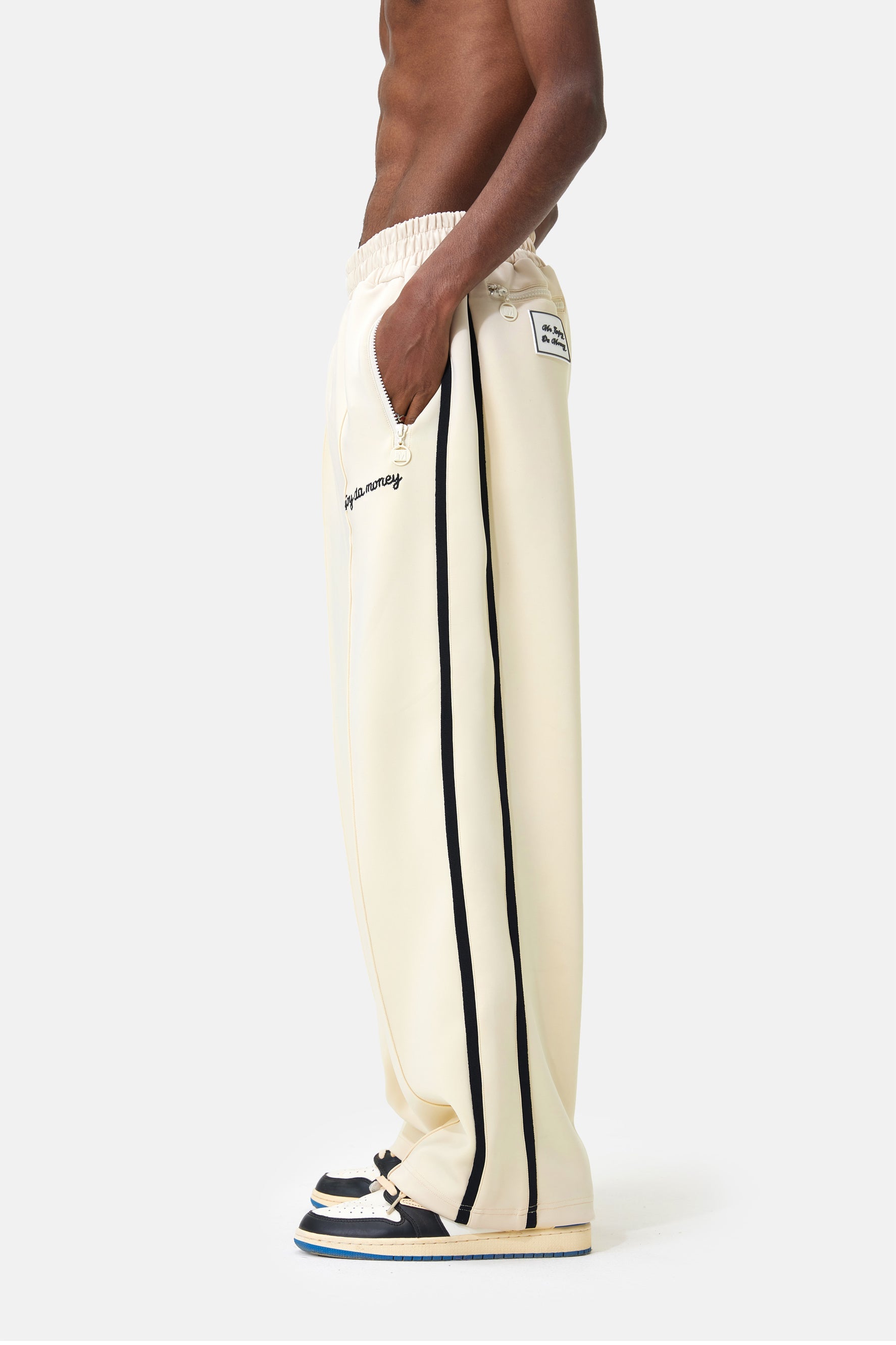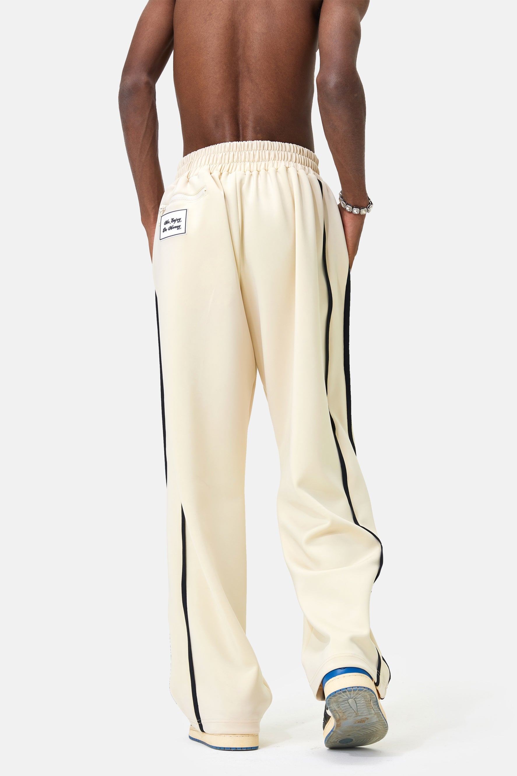このトラックパンツは、ストレートレッグのリラックスフィットと両サイドに走るブラックのストライプが特徴です。 内側は柔らかいコットン製。内側にドローストリングが付いたニットウエストバンドと2つのサイドポケット付き。