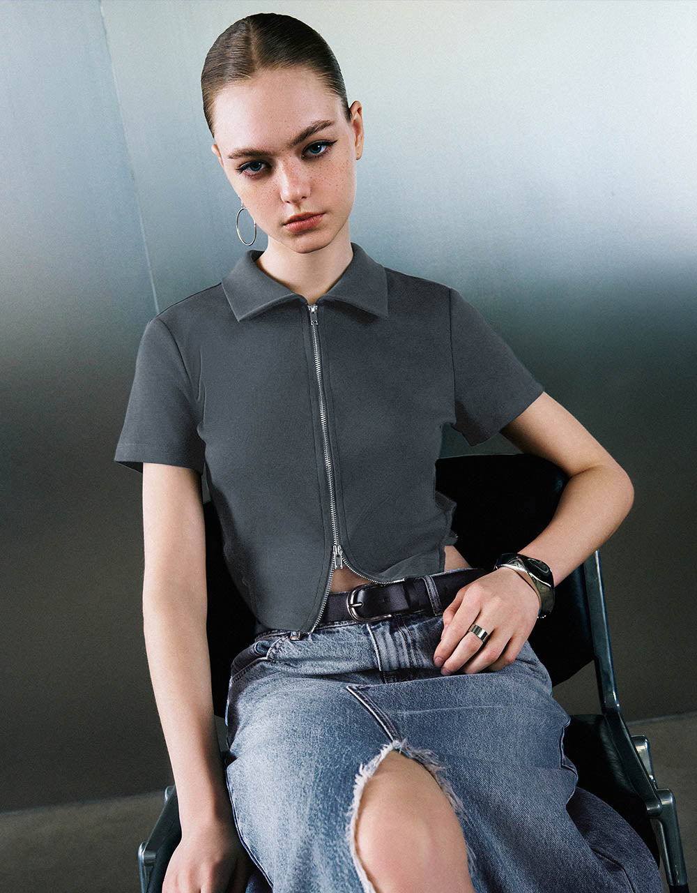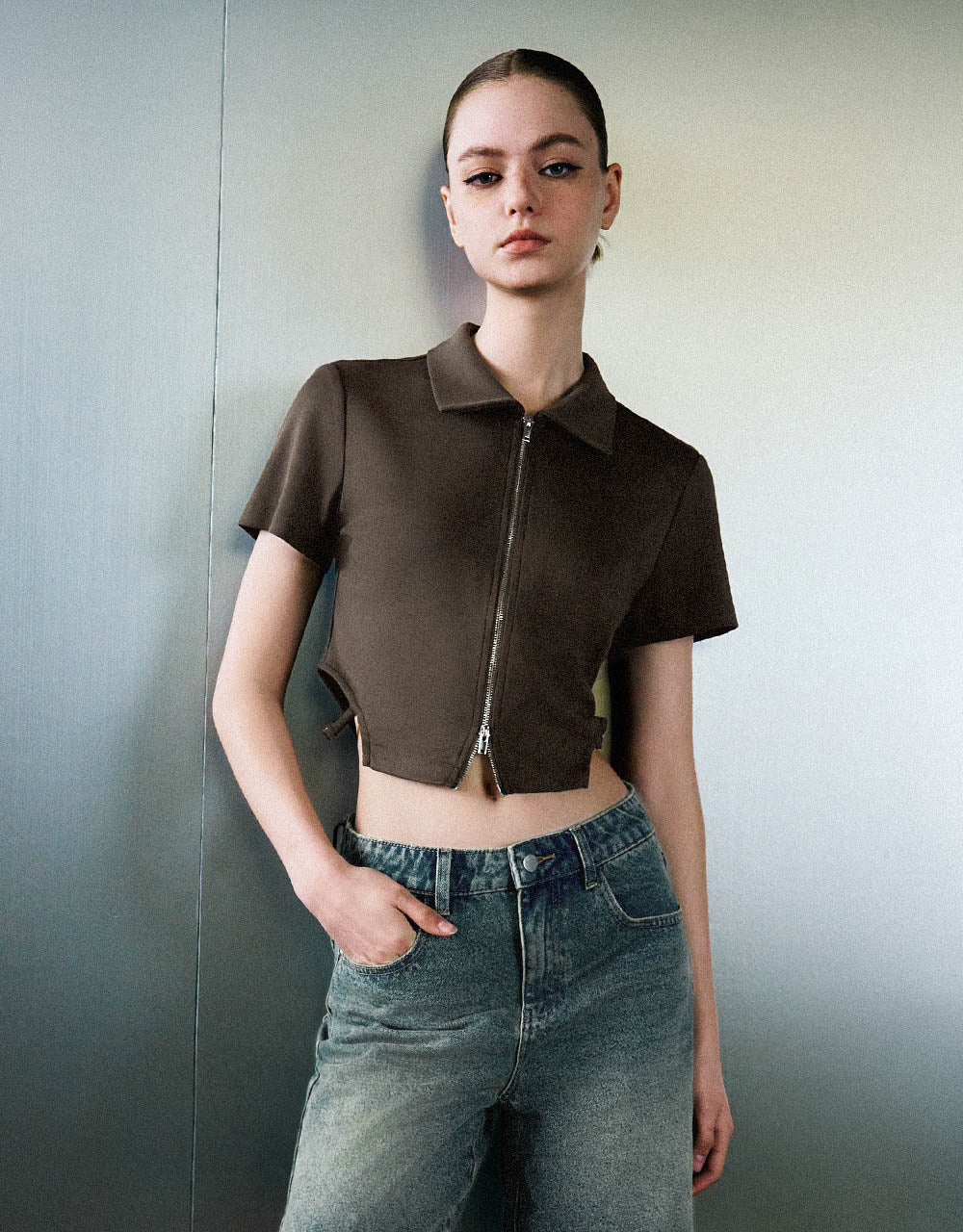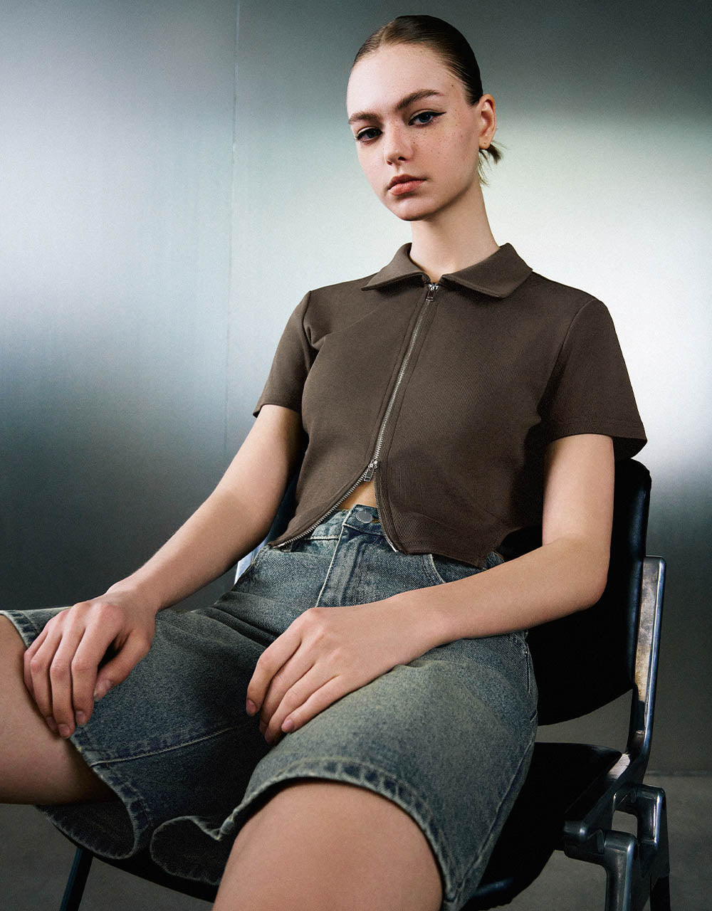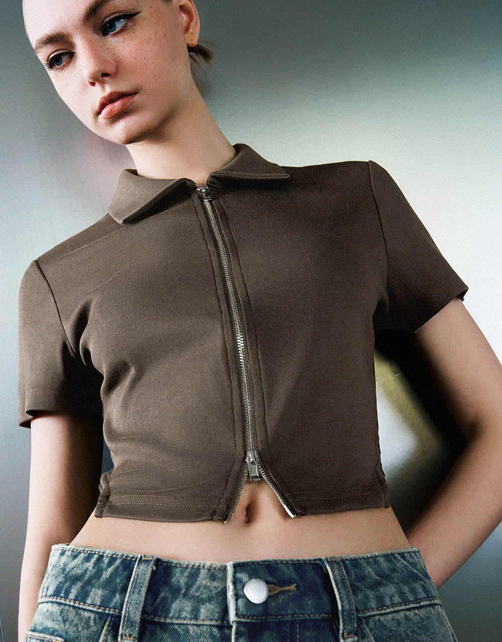 Zipper Front Knitted Lapel Shirt