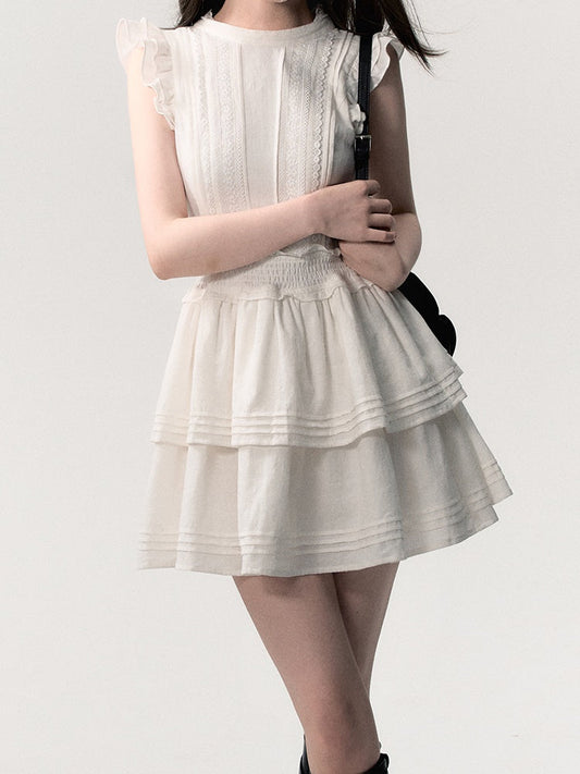 프릴 레이스 플라워 노슬리브 웨이스트 개더 플레어 드레스