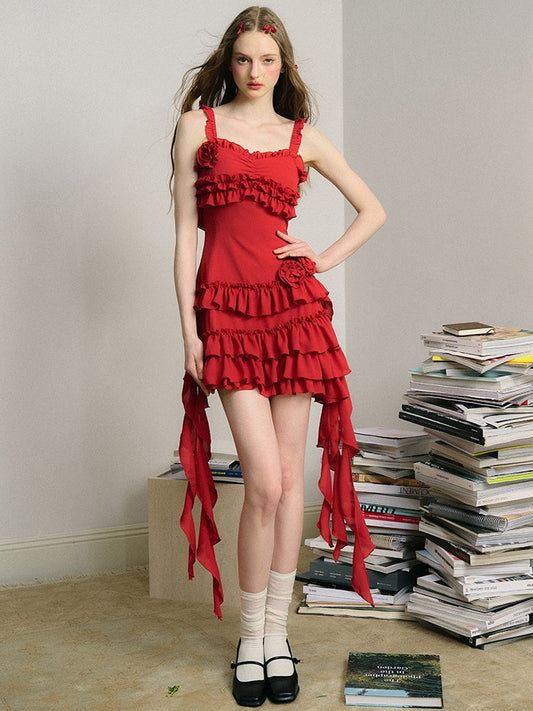 프릴 스트랩 쉬폰 서스펜더 퍼피 드레스