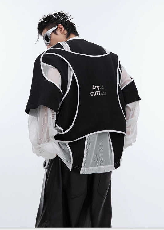 지오메트릭 스플라이싱 레이어드 할로우 에이프런 스커트
