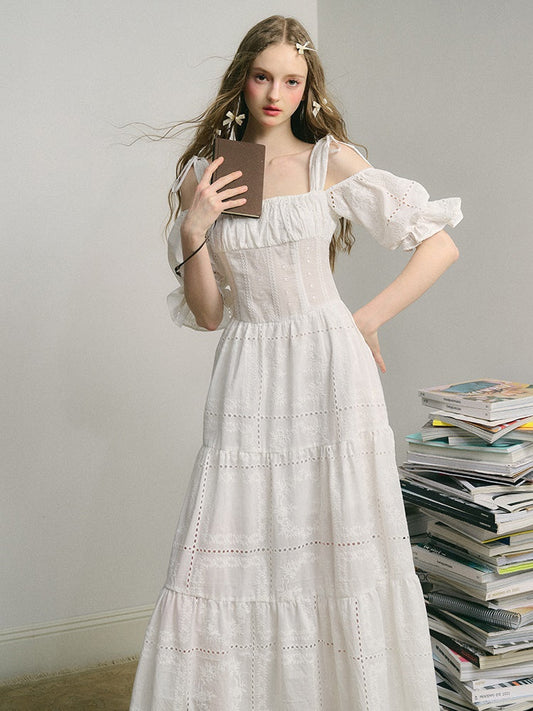 걸리쉬한 자수 중공 레이스 스트랩 롱 원피스