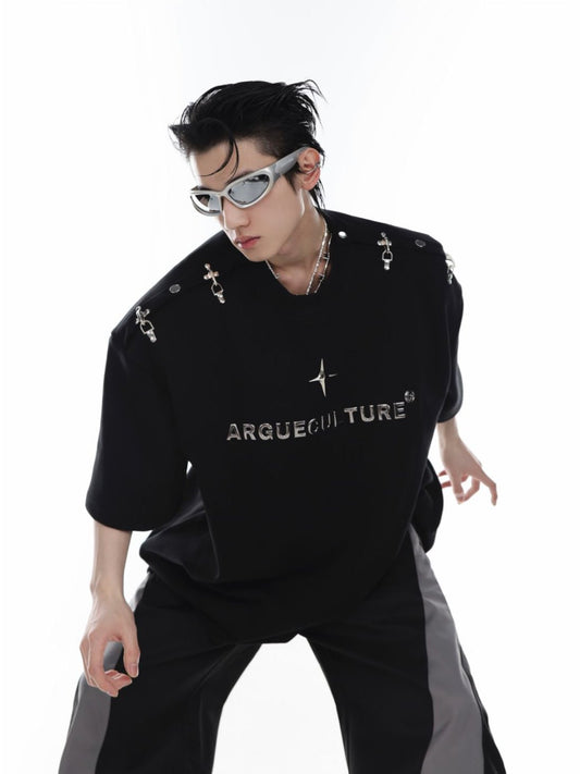 Gender-Neutral Loose T-Shirt with Airplane Buckle & Adjustable Off-Shoulder