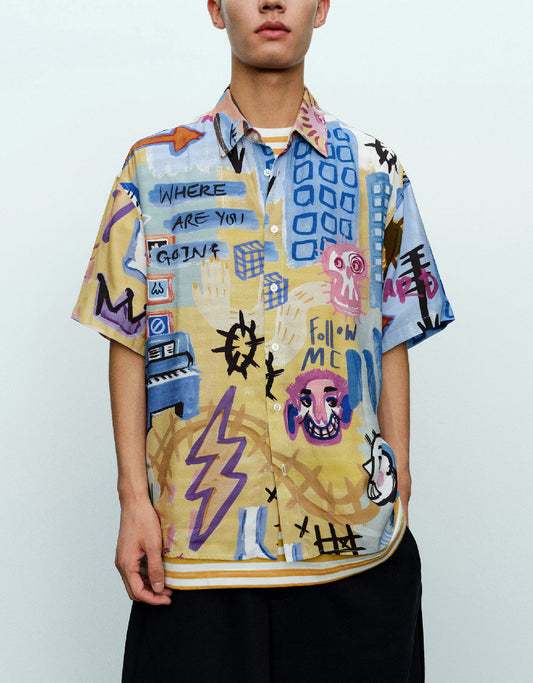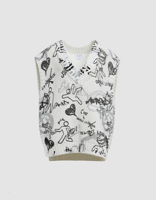 그래피티 프린트 체크 무늬 루즈 재킷 & 플리츠 치마바지 & 조끼 & 벨트