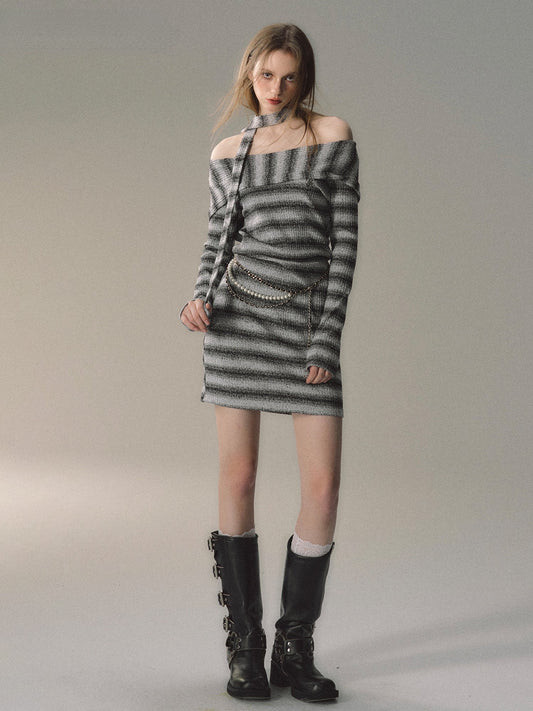 그레이 & 카키 스트라이프 니트 스웨터 드레스