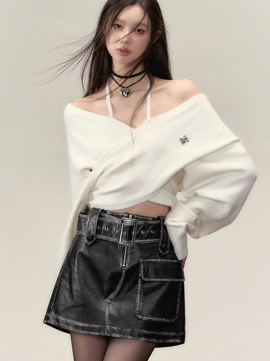 그린 & 살구 홀터 2-in-1 니트 쇼트 스웨터