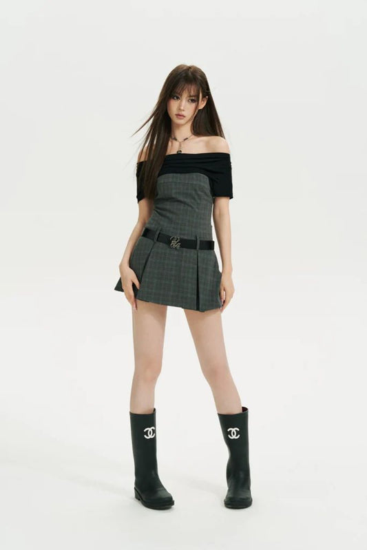 Grey Lace Patchwork High-Waisted Suit Suspender Dress