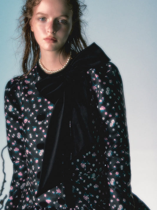 자카드 벨벳 리본 더블 브레스티드 퍼프 슬리브 드레스