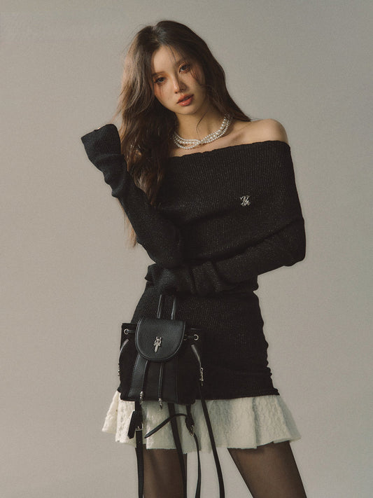 카키&블랙 오프숄더 니트 미니 드레스