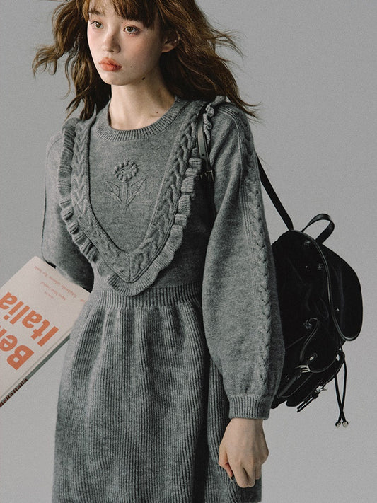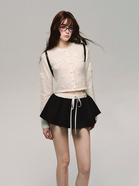니트 플라워 3D 크루넥 여성스러운 레이스 가디건