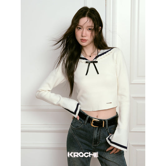 Kroche Color Blocked Bow-Knot Sailor Collar Knit Top White