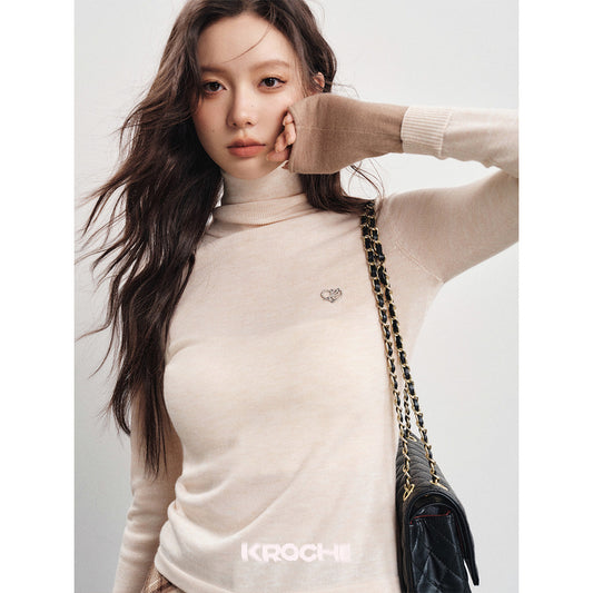 Kroche Color Blocked Cuff Woolen Knit Turtleneck Top Beige