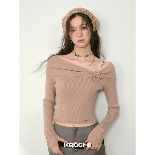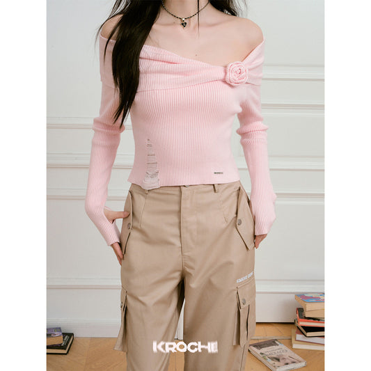 Kroche 3D Rose Off-Shoulder Knitted Top Pink