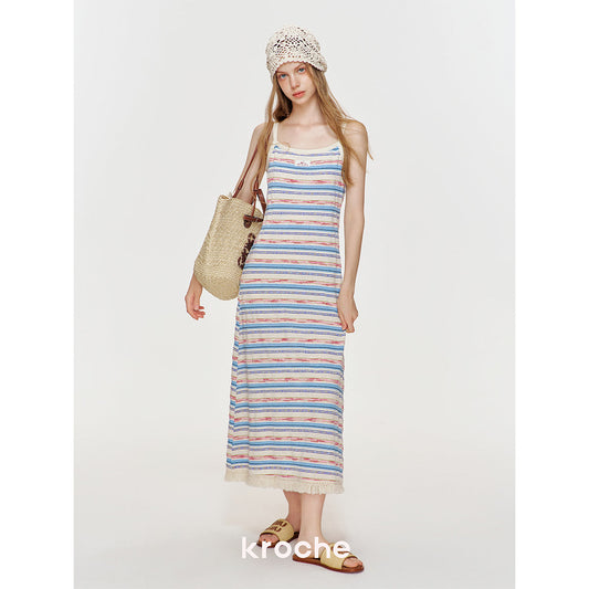 Kroche Color Blocked Tassel Striped Dress Blue And Pink