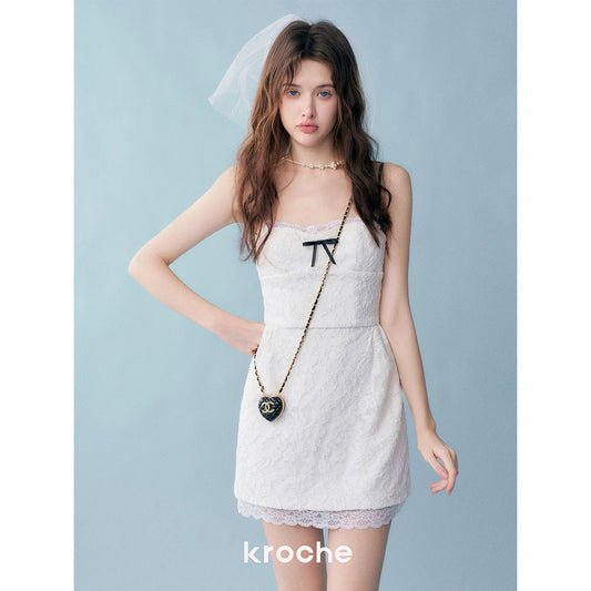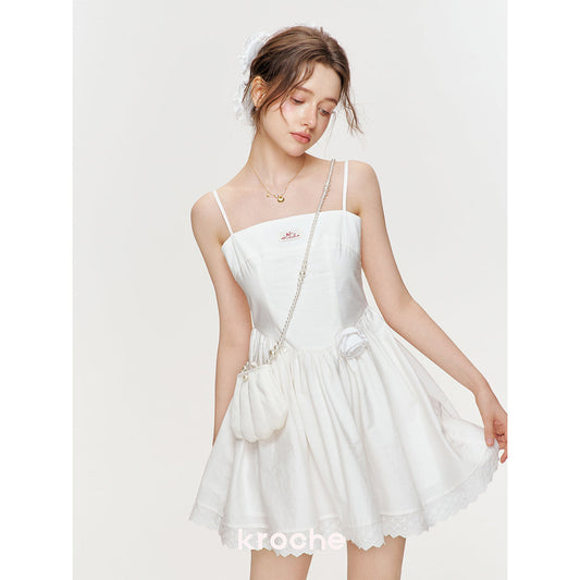 Kroche 3D Floral Hollow Out Lace Edge Halter Dress White