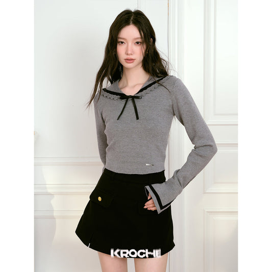 Kroche Color Blocked Bow-Knot Sailor Collar Knit Top Grey