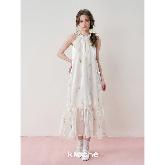 레이스 리본 자수 스플라이싱 민소매 원피스