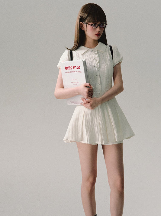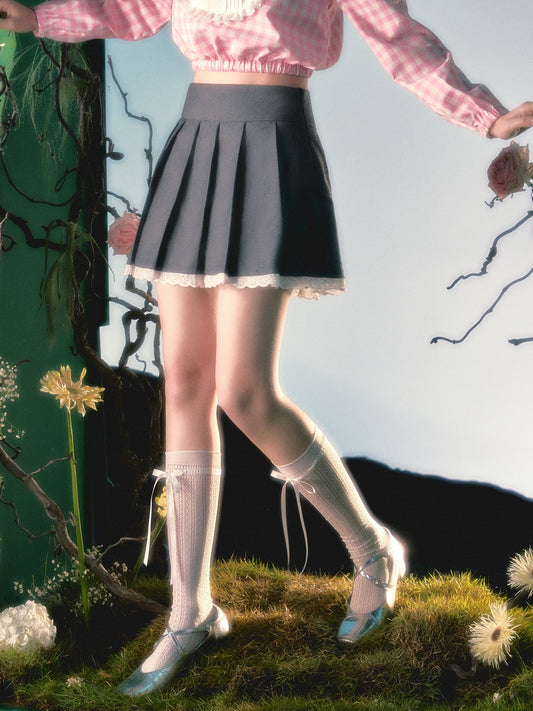레이스 체크 걸리 플리츠 블라우스&숏 스커트