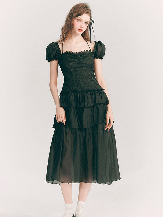 레이스 엘레강트 롱 티어드 시어 퍼프-슬리브 원피스
