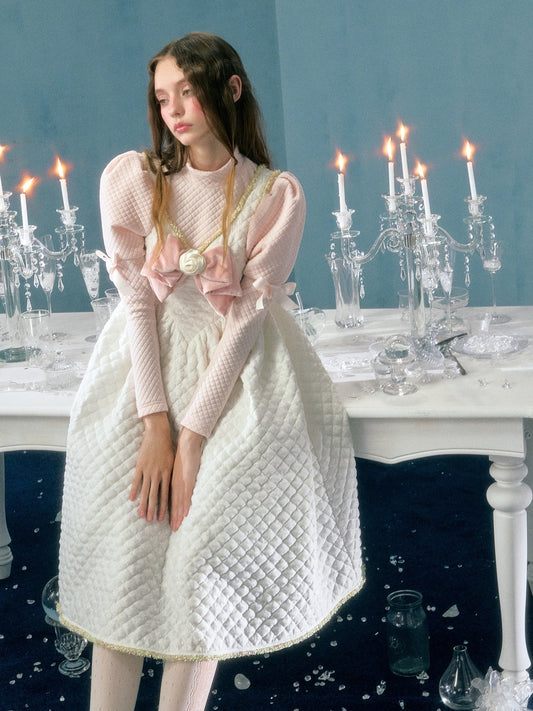 레이스 리본 플라워장식 패딩 서스펜더 드레스&퍼프슬리브 탑