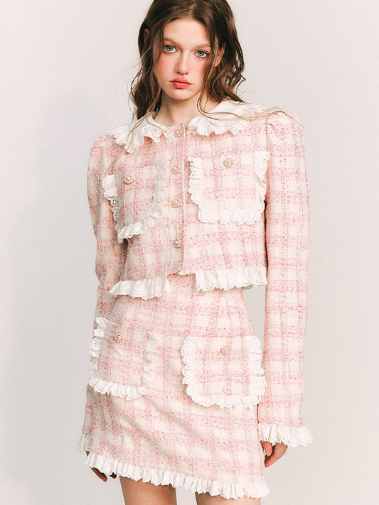 레이스 스티치 체크 무늬 재킷 & 하프 스커트