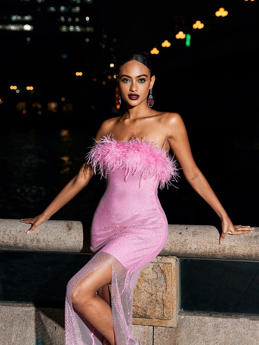 바비 메쉬 라인스톤 맥시 붕대 드레스 핫 핑크