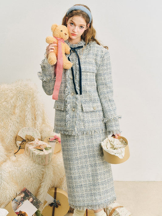 루즈한 실루엣의 트위드 노카라 자켓 & 미디기스 스커트