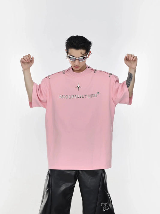Minimalist Metal Toggle Closure Short Sleeve T-Shirt with Pads Shoulder
