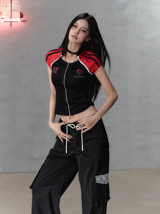 Black Casual Pants with Metal Zipper and Streamer Patchwork Design
