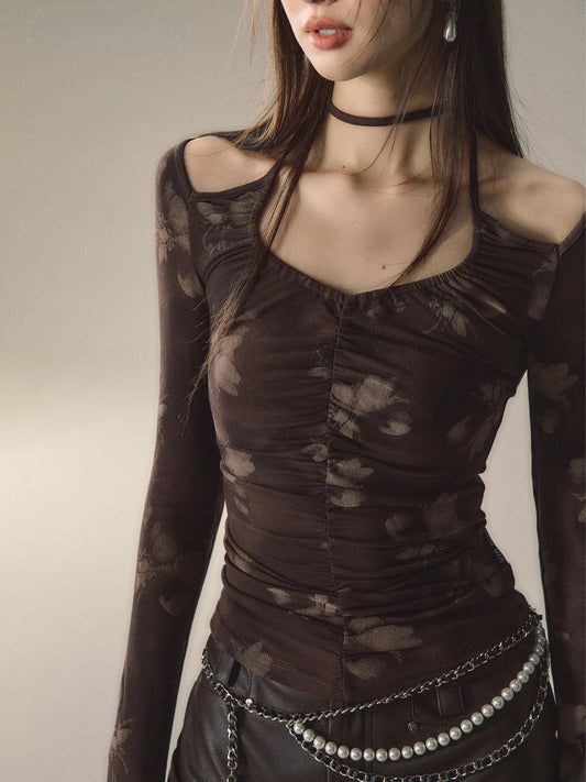 블랙&브라운 오프숄더 프린트 긴팔 티셔츠