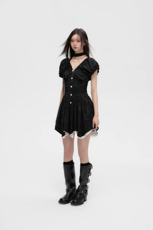 블랙 플로럴 퍼프 슬리브 미디 티 드레스