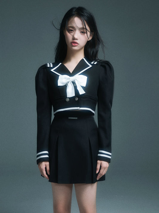 네이비 칼라 퍼프 슬리브 숏 자켓 & 스커트