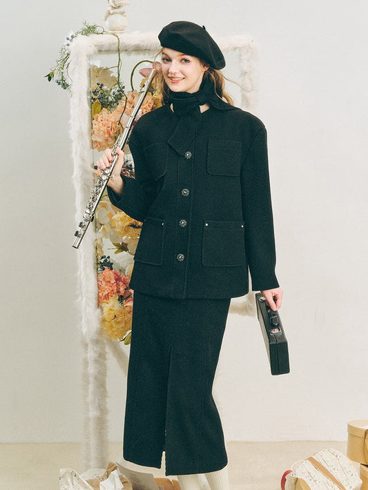 넥 리본 디자인 숏 자켓 & 슬릿 스커트