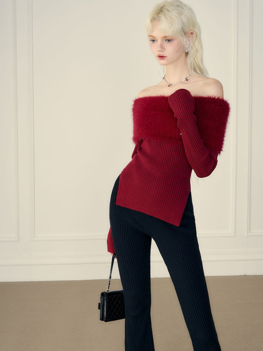 오프 숄더 사이드 슬릿 퍼 골지 니트