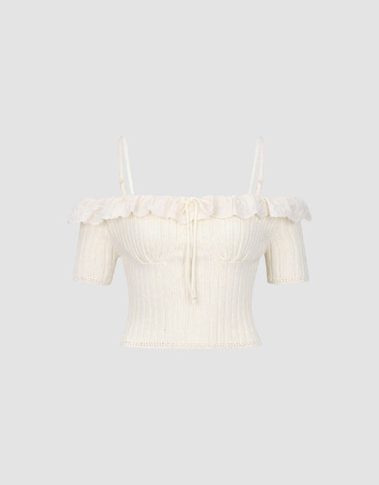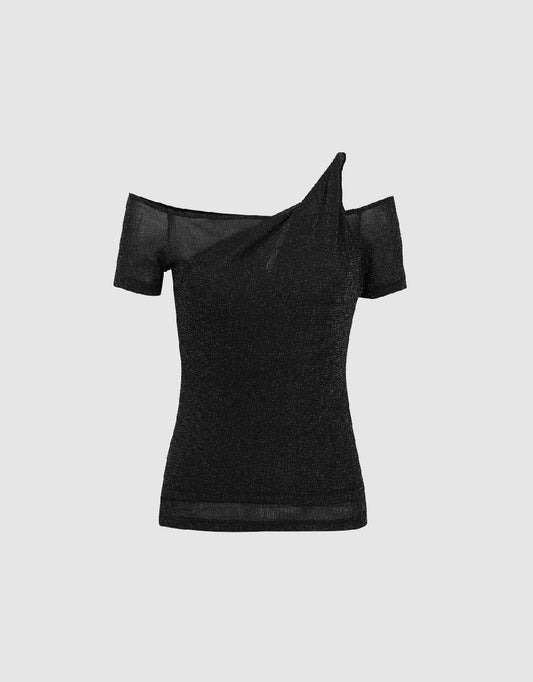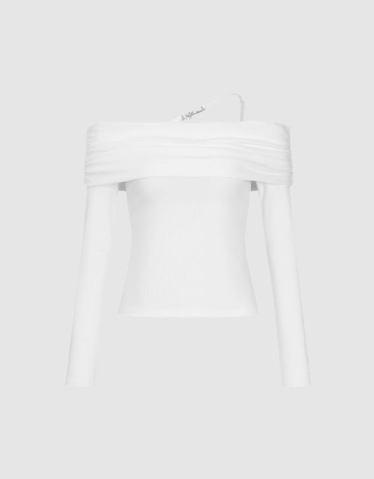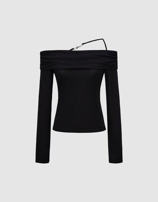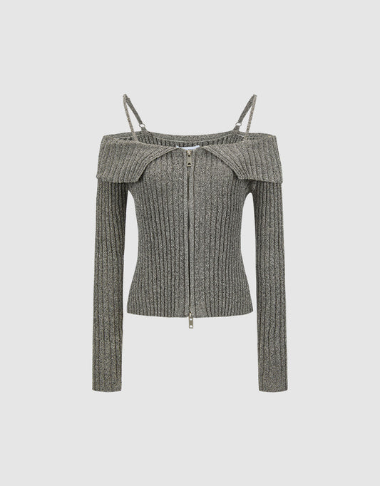 Off-Shoulder Zipper Front Knitted T-Shirt