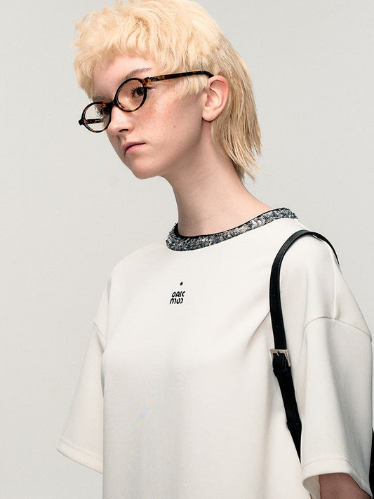 Ovresize 빅 실루엣 심플 크루넥 스팽글 티셔츠