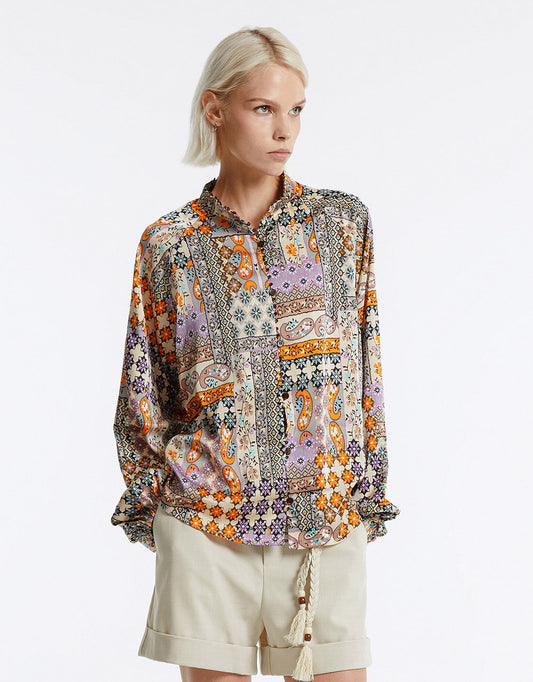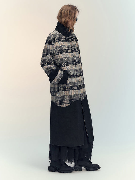 패치워크 레트로 스탠드 칼라 코트 롱자켓
