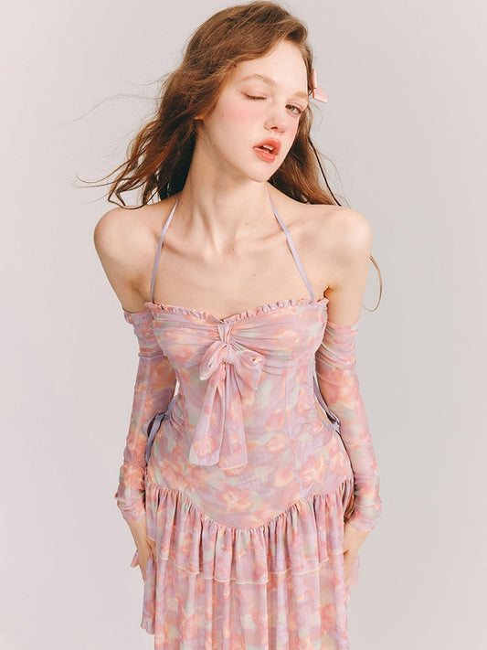 파스텔 백오픈 리본 티어드 플로럴원피스