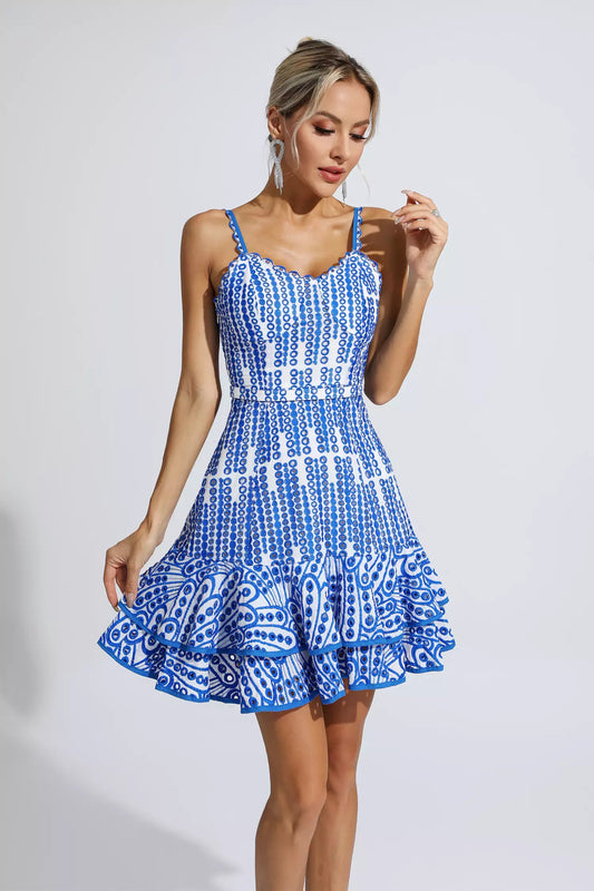 페이즐리 블루 컷아웃 러플 미니 드레스