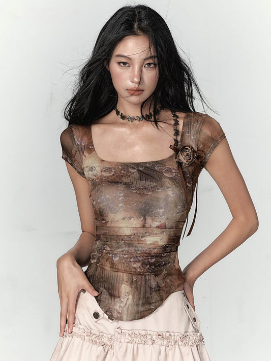Pink & Yellow Off-Shoulder Mesh Rose Print T-shirt