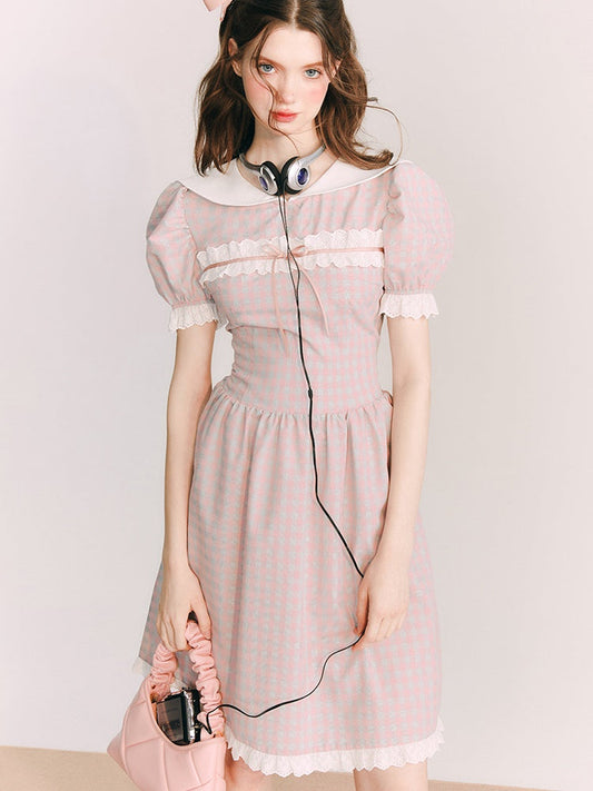 격자 무늬 인형 칼라 레이스 보우 퍼프 슬리브 드레스